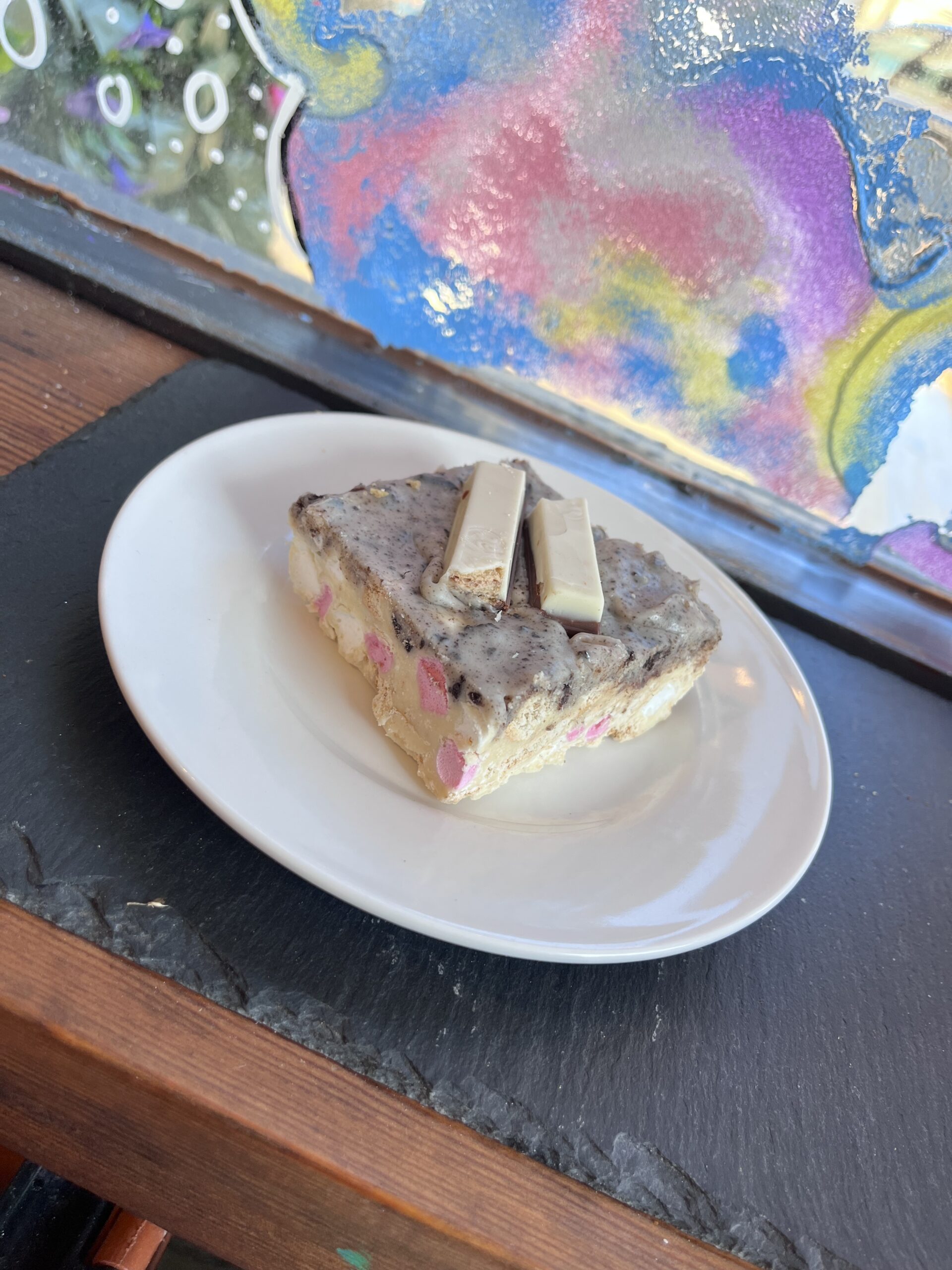 Exquisite Rocky Road created with luxurious Belgian white chocolate, brimming with crisp shortcrust cookies and real Haribo Marshmallows, coated in a luscious cookie cream layer and adorned with traditional Kit Kat bars.